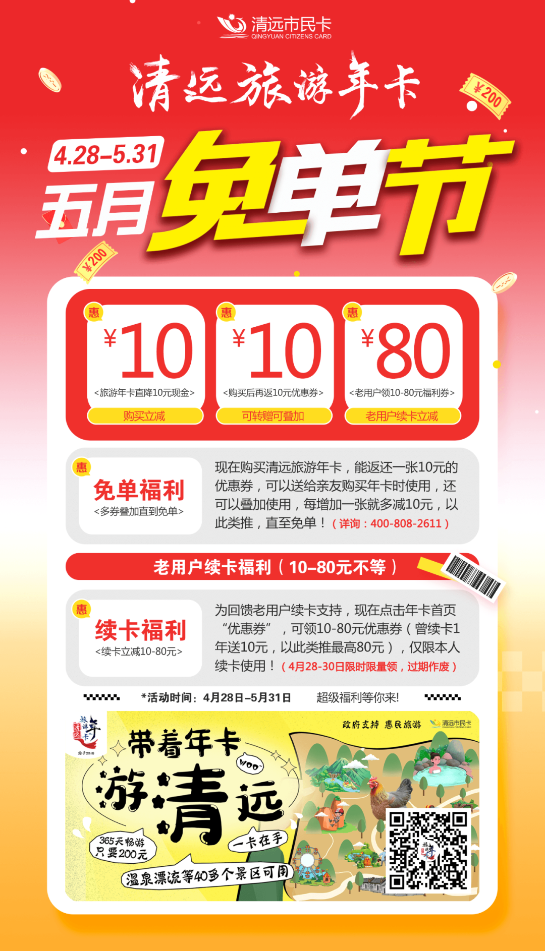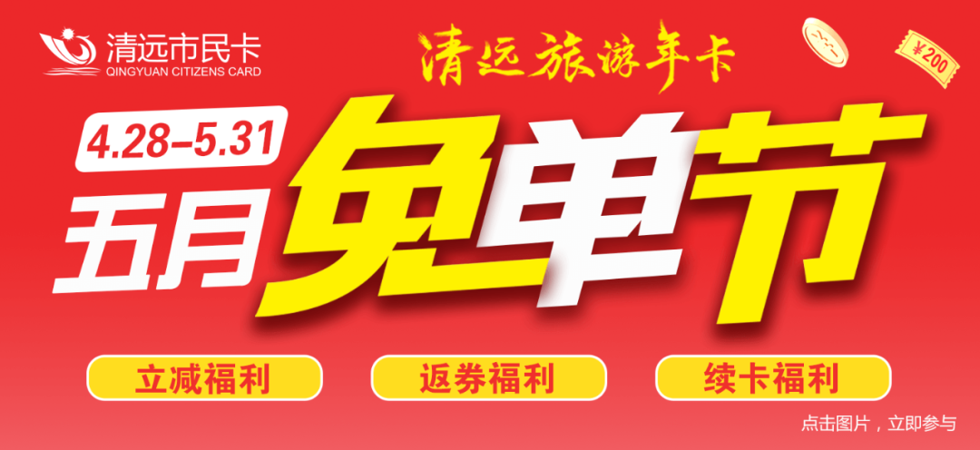 为落实《关于进一步培育新增长点繁荣文化和旅游消费的若干措施》的文件,发扬清远市民卡“便民、惠民、利民”的宗旨,特举办清远旅游年卡“五月免单狂欢节”活动!