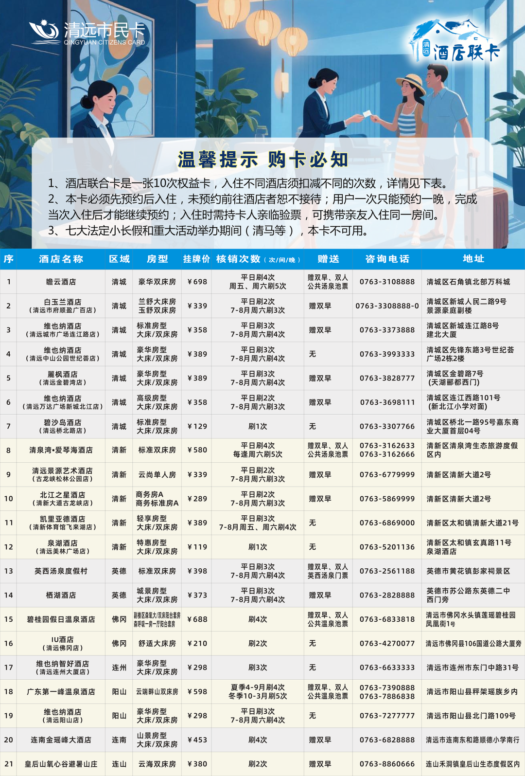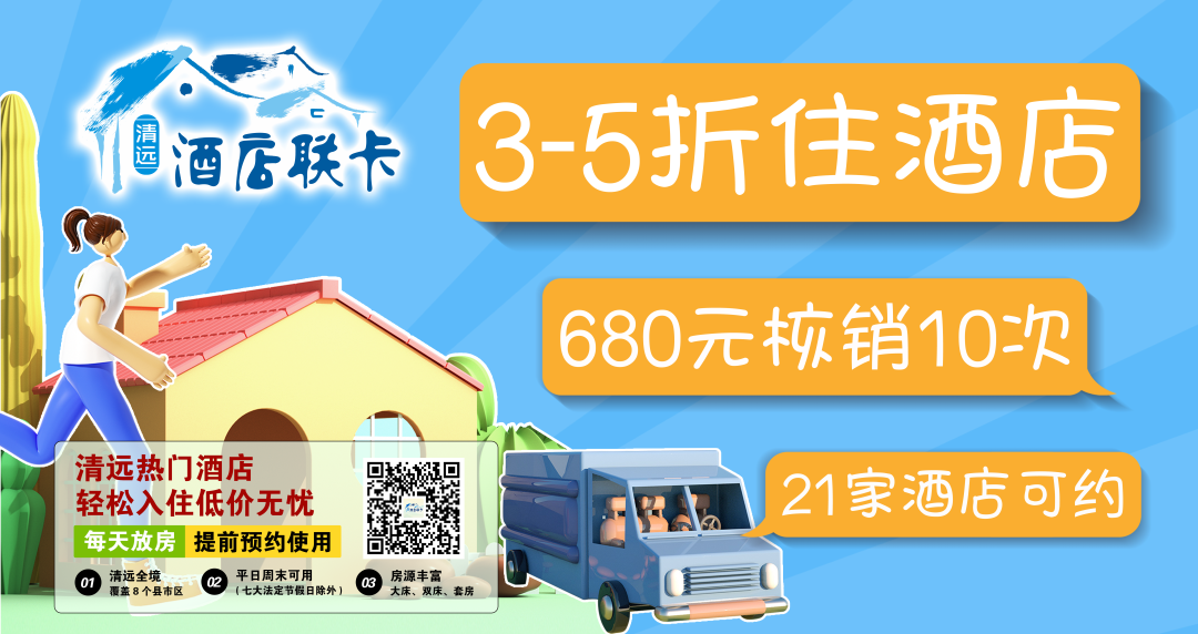 作为清远市民卡系列的全新力作,清远酒店联合卡是继清远旅游年卡、广清旅游年卡、亲子童萌卡之后,专为满足市民及周边游客“高频住宿、高性价比度假”需求打造的重磅新品!仅需 680 元,即可锁定 1 年有效期内 10 次住宿核销权益,无需额外支付房费——根据预约入住的酒店价值(如经济舒适型、品质度假型、高端体验型等)扣减对应次数。无论是清远本地家庭周末近郊住宿、广清通勤族短途度假,还是亲友结伴出游,都能以低成本享受多样化住宿选择,轻松解锁 “说走就走的清远之旅”。
