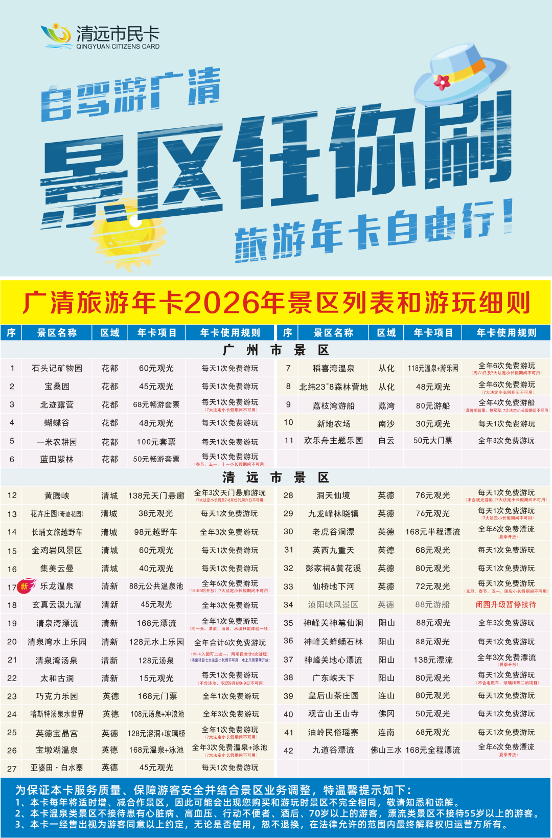 【广清惠民旅游年卡】每卡每年300元,自购买之日起365天有效,2025年免费进入40多家广清景区游玩。