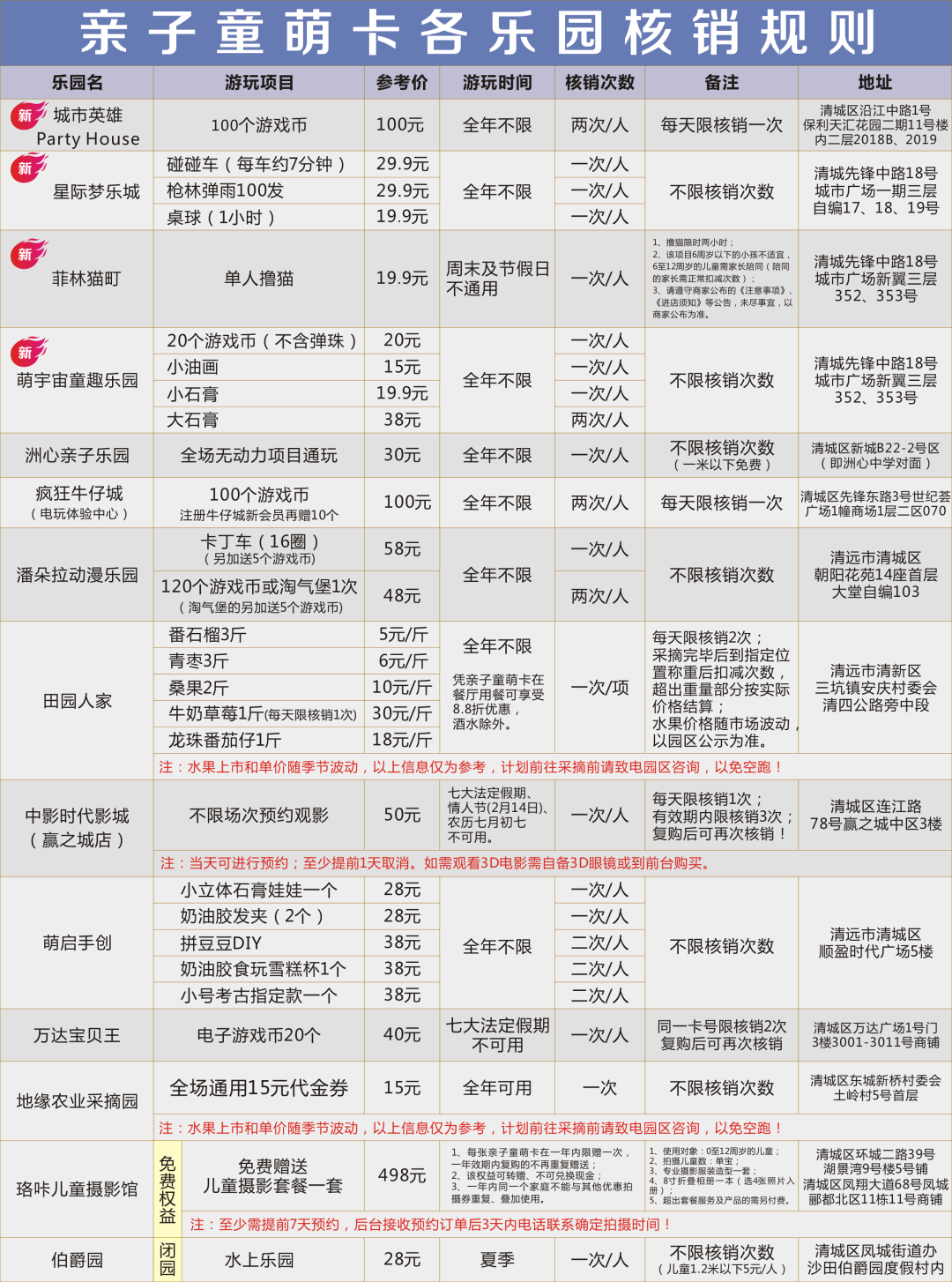 亲子卡每卡每年138元,享受10次核销权益,自购买之日起365天有效,2024年可进入多家清远市区游乐园游玩。