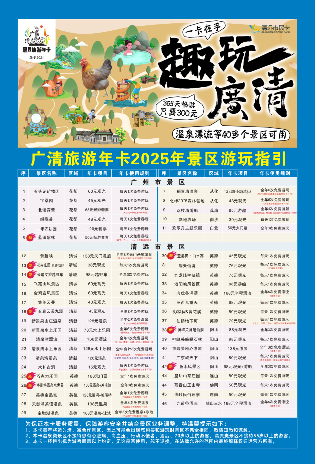 【广清惠民旅游年卡】每卡每年300元,自购买之日起365天有效,2025年免费进入40多家广清景区游玩。