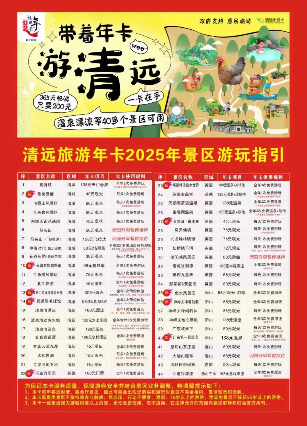 【广清惠民旅游年卡】每卡每年300元,自购买之日起365天有效,2025年免费进入40多家广清景区游玩。
