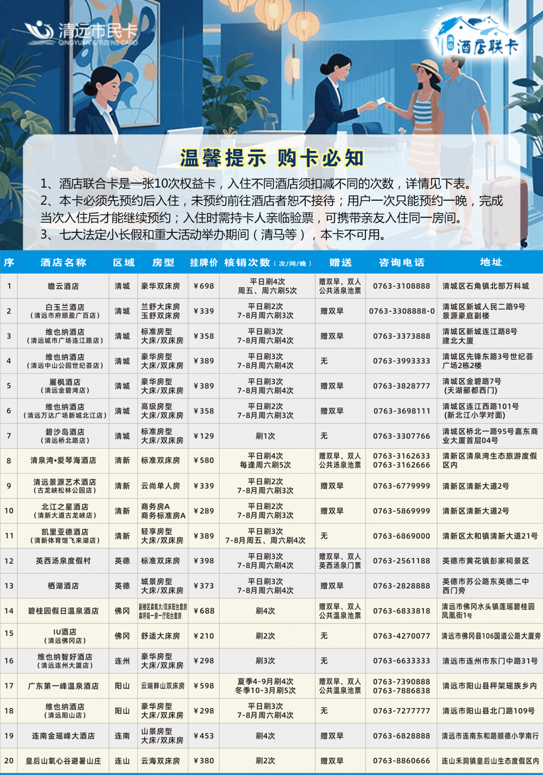 作为清远市民卡系列的全新力作,清远酒店联合卡是继清远旅游年卡、广清旅游年卡、亲子童萌卡之后,专为满足市民及周边游客“高频住宿、高性价比度假”需求打造的重磅新品!仅需 680 元,即可锁定 1 年有效期内 10 次住宿核销权益,无需额外支付房费——根据预约入住的酒店价值(如经济舒适型、品质度假型、高端体验型等)扣减对应次数。无论是清远本地家庭周末近郊住宿、广清通勤族短途度假,还是亲友结伴出游,都能以低成本享受多样化住宿选择,轻松解锁 “说走就走的清远之旅”。