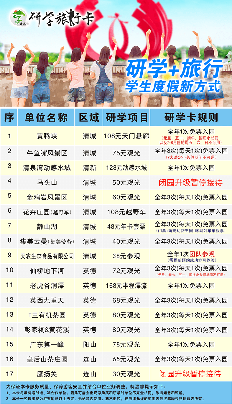 研学卡每人每卡每年99元,自购买之日起365天有效,2024年可免费进入19家清远景区/企业游玩研学。