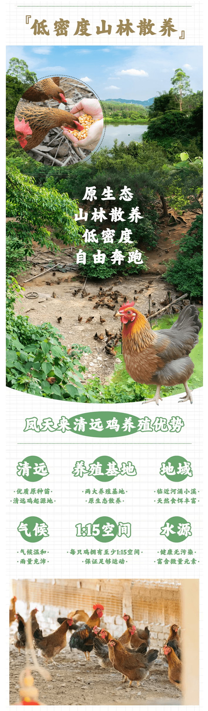 凤天来拥有自家的生态养殖基地,坚持山林低密度散养,喂养特调粗粮,让每一只鸡拥有至少1:15的运动面积,保证它可以根据天然习性生活,自然生长,养足时日。所以皮爽肉劲,鲜香可口,营养丰富易吸收,富含硒、维生素E及风味物质肌苷酸等,还蕴含OMEGA-3不饱和脂肪酸和磷脂,有效促进胆固醇代谢,保护心脑血管。