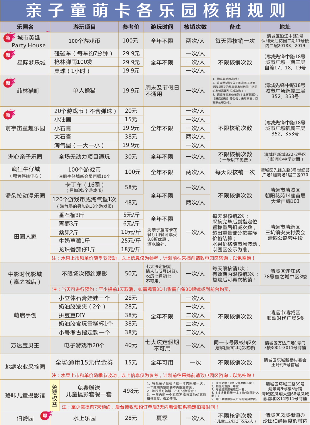 亲子卡每卡每年138元,享受10次核销权益,自购买之日起365天有效,2024年可进入多家清远市区游乐园游玩。