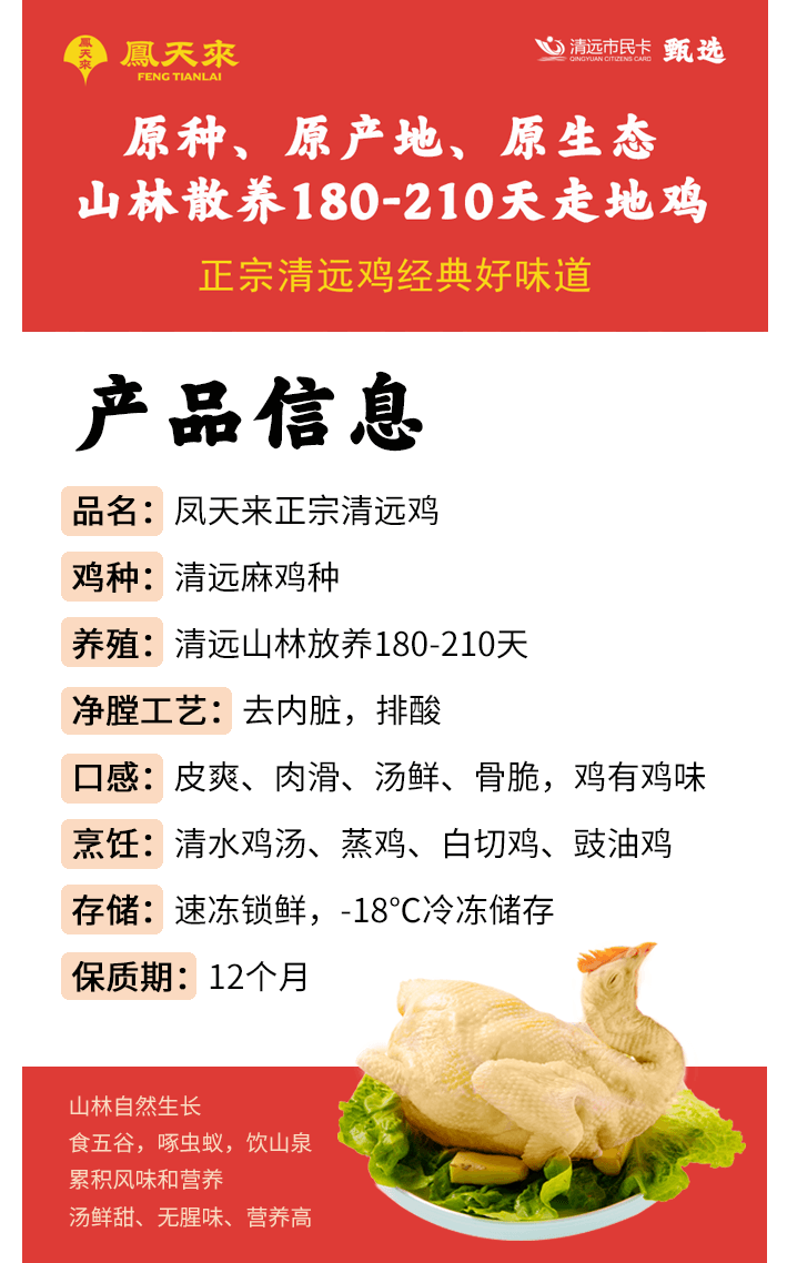 凤天来隶属恒达(广东)食品有限公司,是清远市本土清远鸡的品牌。公司自建养殖场、屠宰场、加工中心以及销售门店,从育种选型直到端上餐桌,从源头开始打通全产业链,只为服务一个目标:将健康有机、鸡有鸡味的优质原种清远鸡食材,奉上国人的餐桌!