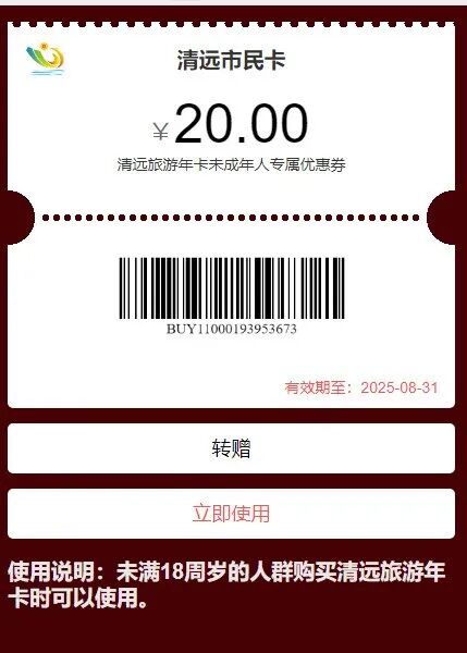 系统即时返还一张价值20元的未成年人专属电子优惠券!
