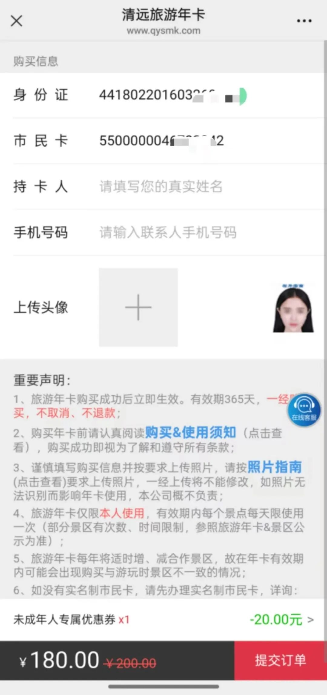 帮未成年人购买年卡,输入身份证号码,
