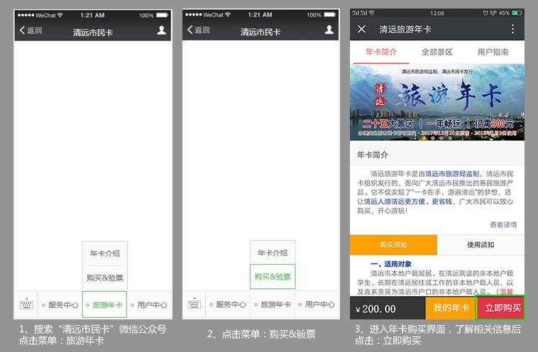 1)微信公众号线上购买成功的,可以选择持手机到景区识别二维码或者持市民卡嘀卡两种识别方式;