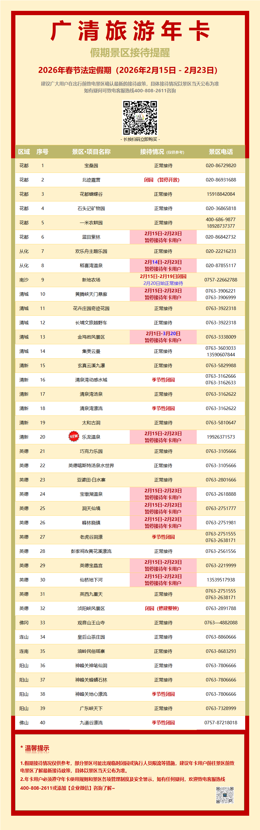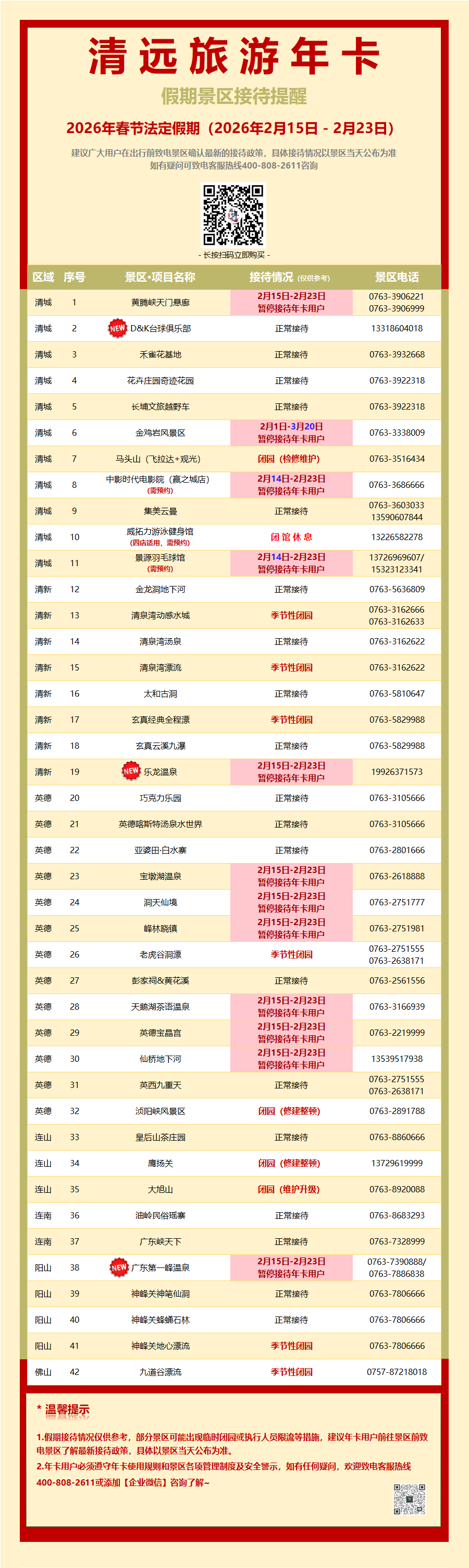 2026年春节期间清远旅游年卡共19个景区/项目正常接待,其中18个项目无需预约,清远旅游年卡用户可直接刷脸/刷码进入景区。D&K台球需要提前预约使用!