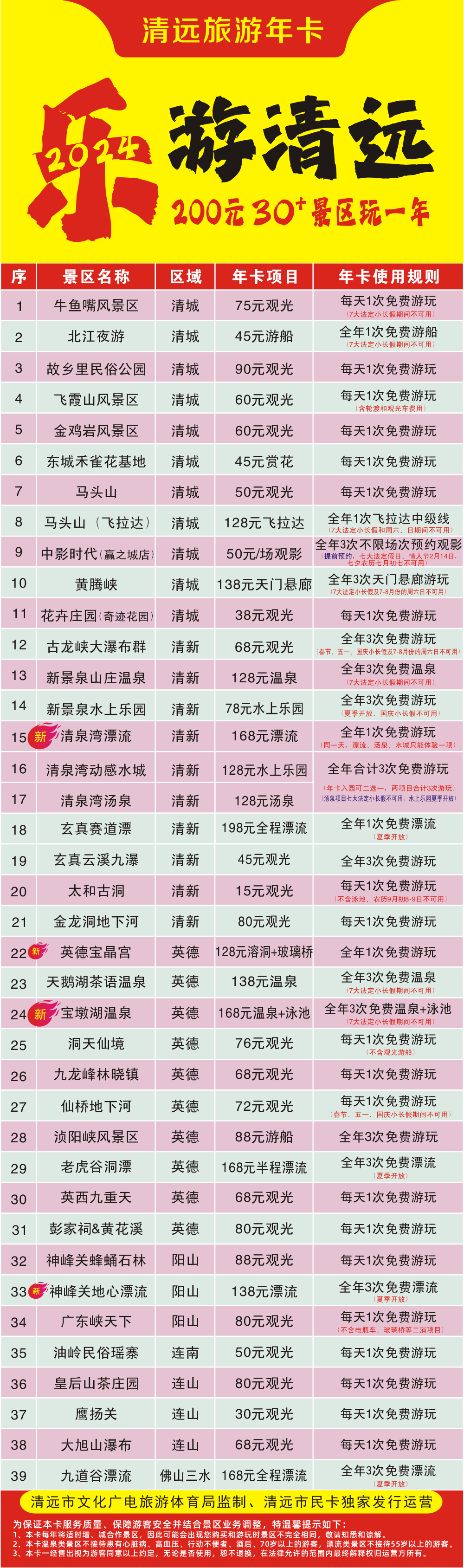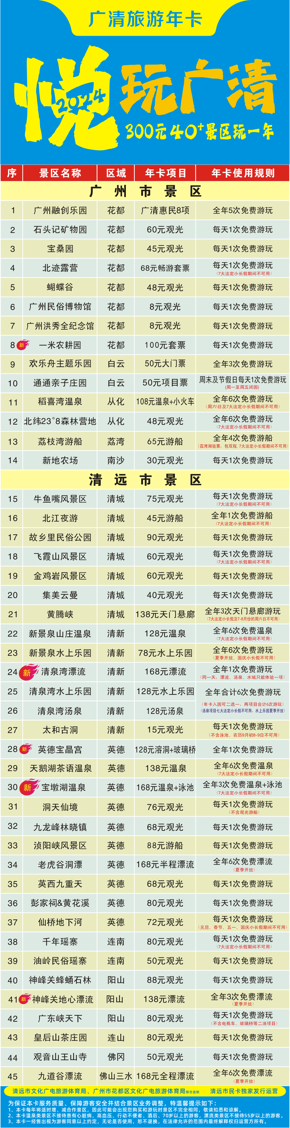 【广清惠民旅游年卡】每卡每年300元,自购买之日起365天有效,2024年免费进入40多家广清景区游玩。