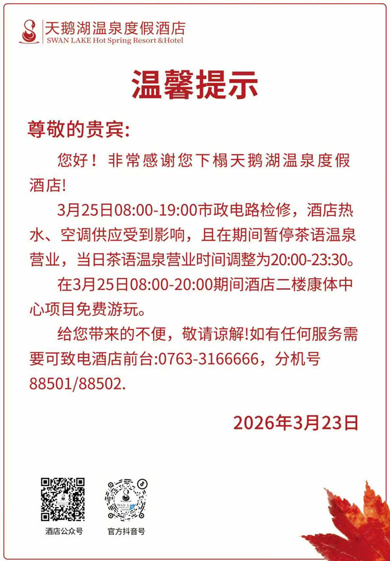 茶语温泉因市政电检修,于2026年3月25日白天08:0019:00期间需暂停营业,3月25日当天营业时间调整为20:00-23:30。如有不便,敬请留意。